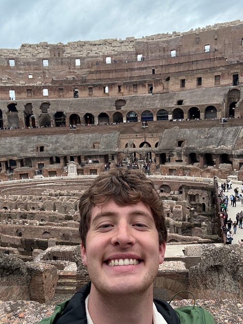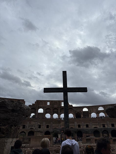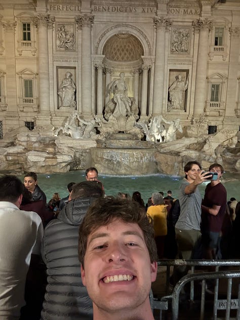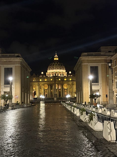 We stayed in the Forum until the workers kicked us out, by which time night had fallen and rain was coming down thick and fast. We escaped the elements by visiting an Irish pub called Finnegans, where we watched most of the Napoli vs. Inter Milan match on that night. The prices were too high and we didn’t have seats half of the time, but it served its purpose. I had a Corona, which amused me—a Mexican beer in an Irish pub in Rome. Make that make sense. Anyhow, we also decided to get up early to ensure we could get into St. Peters the next day. Since admission was free and Pope Leo XIV was presiding over mass, we knew it would be packed, but we figured that our trip would be incomplete if we didn’t at least give it the old varsity try. We headed back to our hostel and got to bed a little after 11pm, eager for sleep to replenish us before our alarms went off at 4:30am.