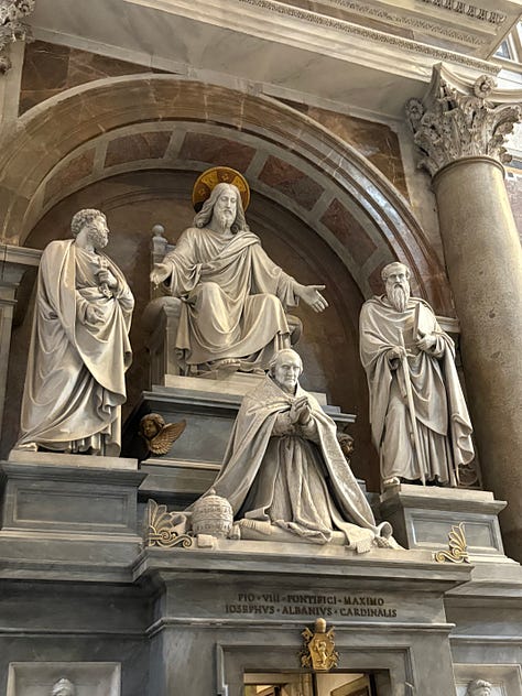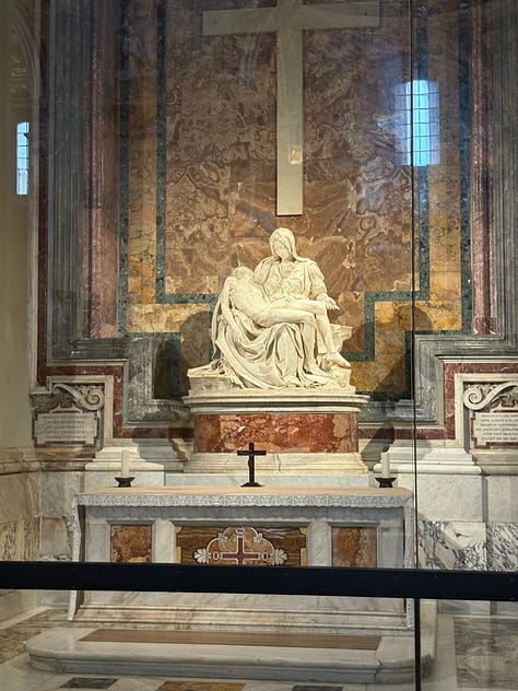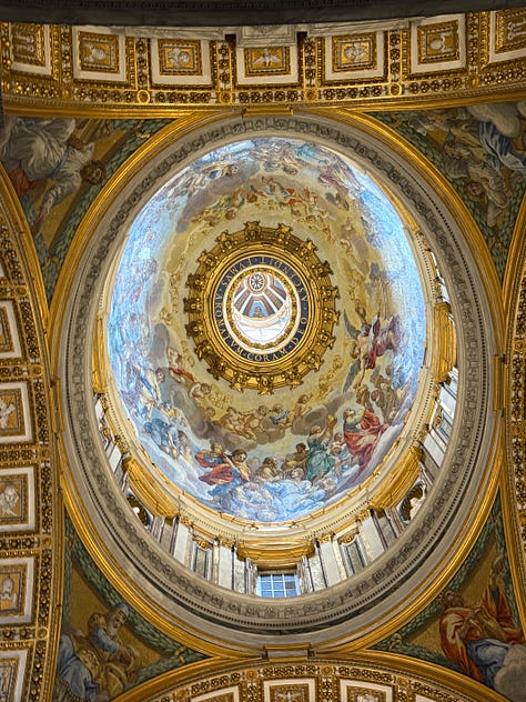 43–51: Inside the basilica. Some highlights were Michelangelo’s Pieta statue, the altar, and the amazing ceiling. The view of the courtyard will be familiar to Conclave (2024) viewers.