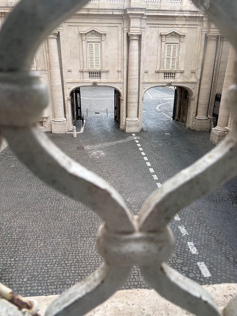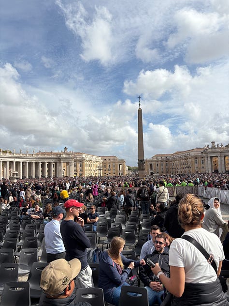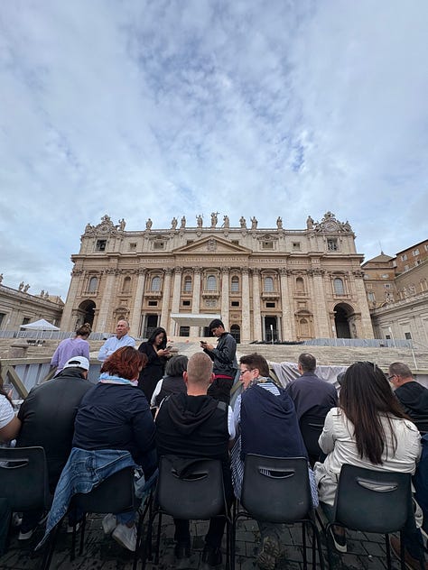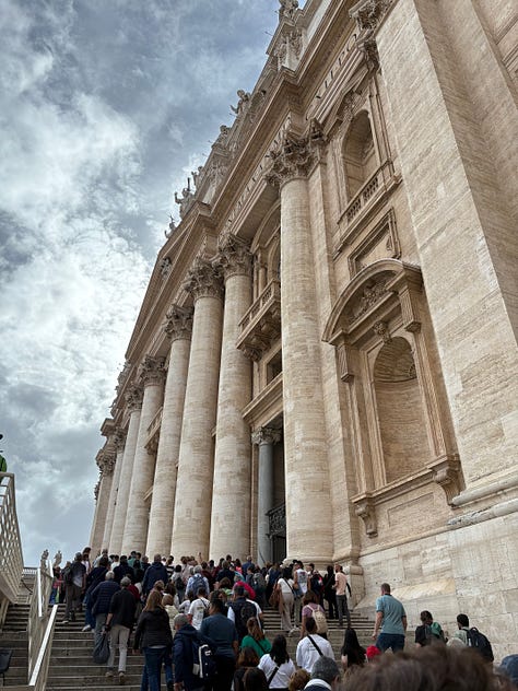 We checked out of the hostel promptly at 5am and took a taxi down to St. Peter’s. We were thrilled to see that we were among the first 15 people in line to enter. By the time we got in at 7:30, the back of the line was out of sight. We didn’t have the special tickets needed to enter the Basilica itself for Mass, but we were in the third row of seats set up in front of the Basilica. I read while we waited for the 10am mass to begin, chuckling to myself every now and then; it was hard to believe I was attending a papal mass at St. Peters in Rome. I’m not a Catholic, but it was hard not to feel a certain amount of awe at the grandeur of the whole scene. The mass itself was difficult to follow, not only because I’m not Catholic but also because it was almost entirely in Italian. After the mass ended, we stayed in our seats for a while in hopes that Pope Leo would make an appearance in the Pope-mobile. That didn’t happen, but he did address the crown from a window of one of the buildings nearby. Unfortunately, part of the Basilica mostly blocked our view of him.