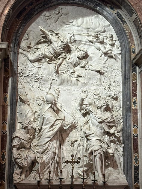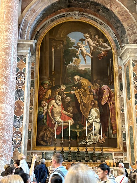 It was time to catch our shuttle to the airport for our return flight. But, since it was close to our pick-up point, we stopped by the Basilica of Santa Maria Maggiore, where Pope Francis is buried. After waiting in line and going through security, we only had 10 minutes in the Basilica, but we did indeed see Francis’ tomb. It was simple, like something you’d see in a cemetery, which is exactly what Francis requested. After seeing the elaborate papal tombs in the Vatican, its plainness was refreshing.