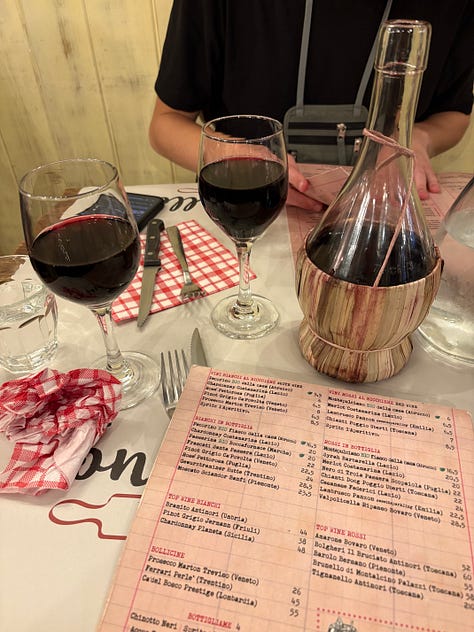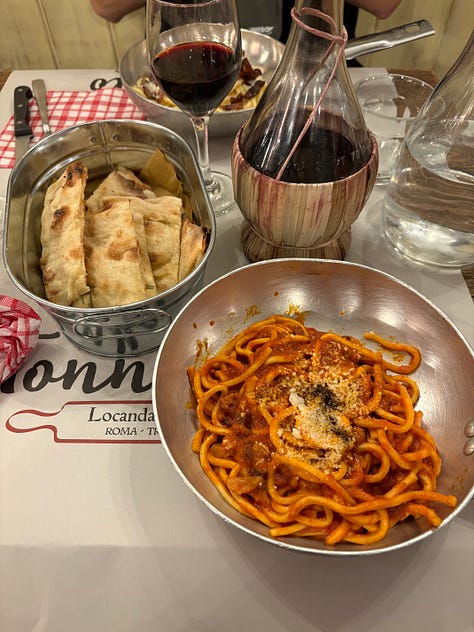 Next, we crossed the Tiber on our way to a neighborhood called Trastevere, which has a very classic look and good restaurants (and some good gelato, we found out). One of our fraternity brothers from Wabash (shoutout Drew Rathbun) recommended a place called Tonnarello for dinner. In short, the food was fantastic. I got amitriciana pasta, and we split some focaccia and a bottle of red wine (which seemed never-ending, especially on a day when we hadn’t drank much water haha). After dinner we went to a couple of bars in Trastevere (again, thanks Rathbun) and walked the hour back to our hostel contented and eager to see more of the city on Saturday.