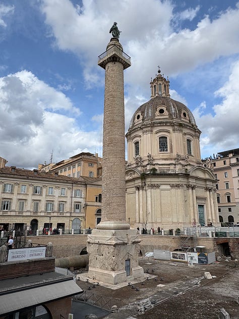 19–27: Trajan’s Column, the Colosseum, bruschetta with prosciutto, pizza, and more views of the Colosseum. Notice the intricate “basement” of the building. This would have been beneath the arena’s wooden, sand-covered floor.
